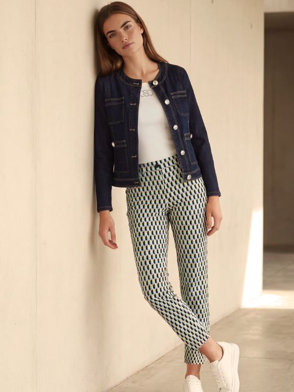 Χαλαρό παντελόνι business σε κλασική γραμμή. Το κουμπί και το φερμουάρ εξασφαλίζουν σταθερή εφαρμογή, ενώ το γραφικό μοτίβο προσδίδει διακριτική δομή στη θηλυκή εμφάνιση