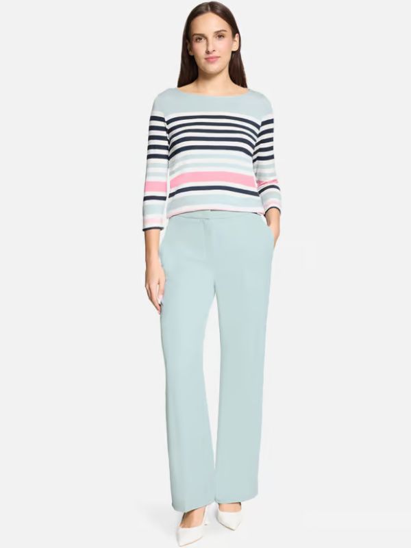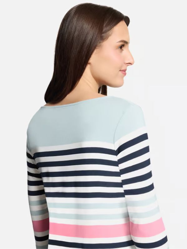 Μπλούζα βασικού στυλ με στενή γραμμή, μέτριο μήκος και κομψή λαιμόκοψη τύπου «υποβρύχιο». Το ριγέ μοτίβο προσδίδει ζωντανές πινελιές στο σύνολο, ενώ η σχεδίαση χωρίς κλείσιμο εξασφαλίζει άνετη και θηλυκή εφαρμογή.