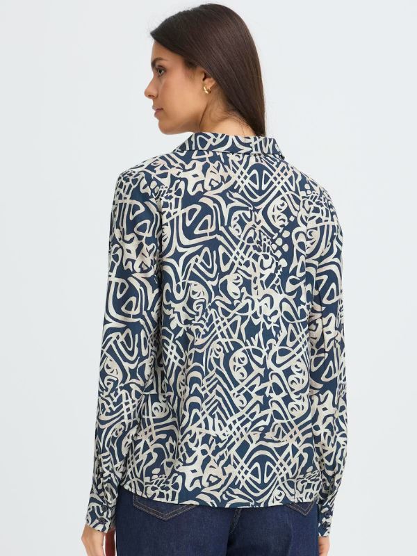 Μπλούζα με μακριά μανίκια και μοτίβο, με δομημένη ίσια γραμμή και ανοιχτό γιακά. Κλείνει με κουμπιά μπροστά. Ελαφριά υφή και σιλουέτα που φτάνει μέχρι τους γοφούς, για μια μοντέρνα εμφάνιση.