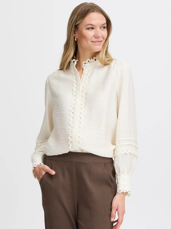 Γυναικείο πουκάμισο, μακρυμάνικο, με δαντέλα στο λαιμό, στα μανίκια και στο μπροστινό μέρος, σε εκρού χρώμα.