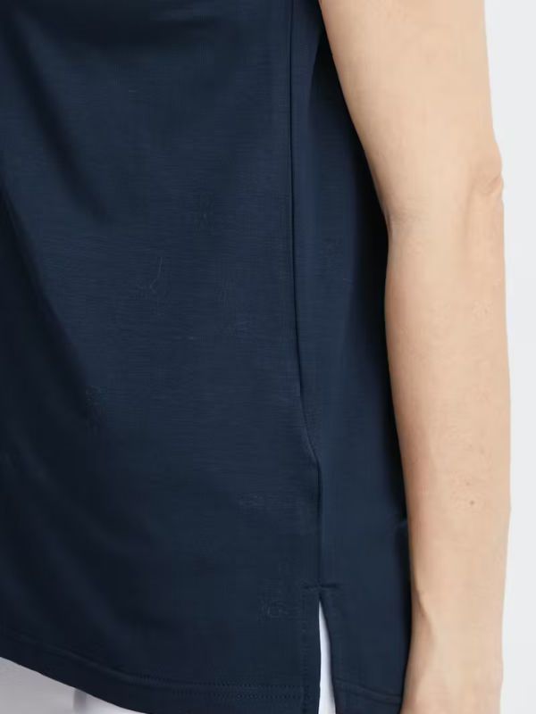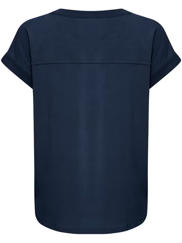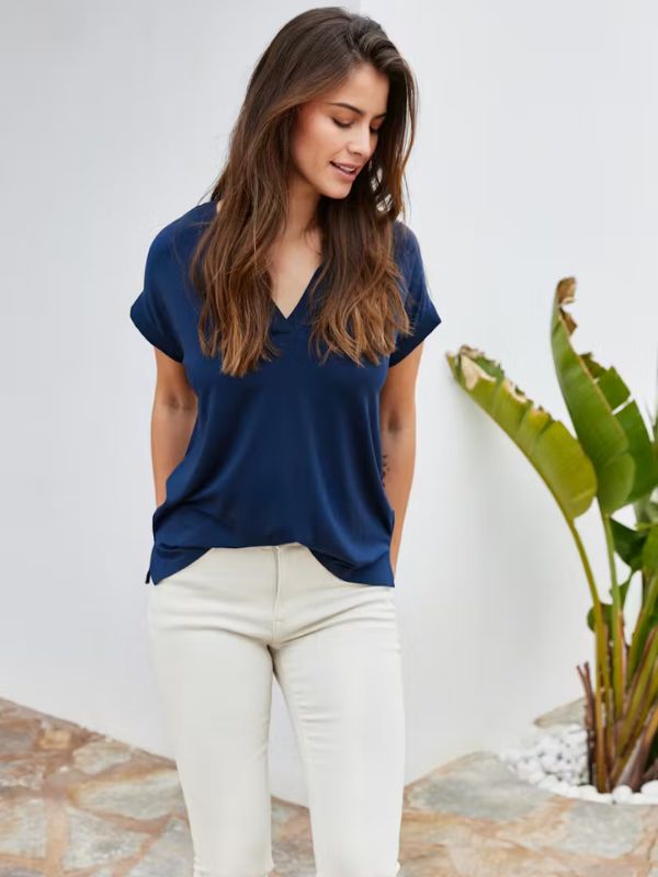 Μπλούζα με V-neck, ίσια γραμμή και απαλό φινίρισμα. Διαθέτει κοντά μανίκια με ρολό, διακριτικές πλαϊνές σχισμές και καμπυλωτό στρίφωμα, για άνετο στυλ και ευελιξία.