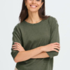 Μπλούζα με στρογγυλό λαιμό, μανίκια 3/4, ίσια γραμμή και εμφανή κουμπιά στους δύο ώμους. Διαθέτει απαλή υφή και ραβδωτές μανσέτες.