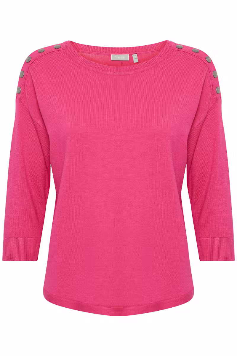 Μπλούζα με στρογγυλό λαιμό, μανίκια 3/4, ίσια γραμμή και εμφανή κουμπιά στους δύο ώμους. Διαθέτει απαλή υφή και ραβδωτές μανσέτες.