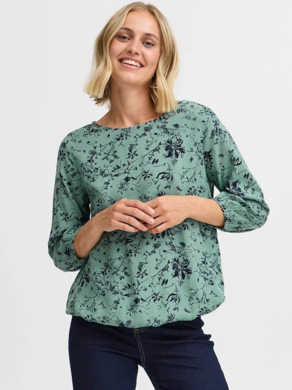 Γυναικεία μπλούζα φλοράλ πράσινη,με στρογγυλή λαιμόκοψη,μανίκια 3/4,λάστιχο στο κάτω μέρος, εμπριμέ πράσινη.
