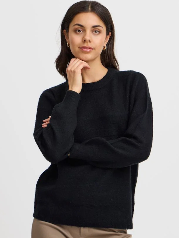 Γυναικείο πουλόβερ πλεκτό, μακρυμάνικο, με στρογγυλή λαιμόκοψη σε μαύρο χρώμα.