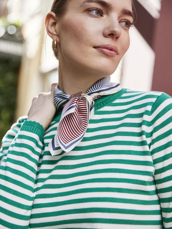 Μαντίλι/φουλάρι με ρίγες, απαλό φινίρισμα, διαγώνιο μοτίβο ρίγων και ελαφριά, ρευστή πτώση. Η τετράγωνη γραμμή του προσφέρει ευελιξία στο στυλ και ανεπιτήδευτη κομψότητα.