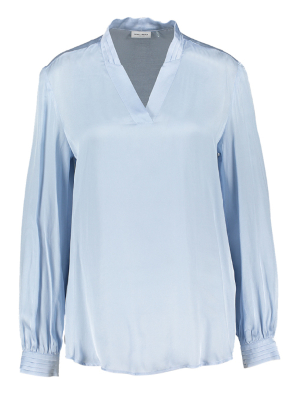 Γυναικεία μακρυμάνικη μπλούζα, με V λαιμόκοψη, σε σιέλ χρώμα από γυαλιστερό ύφασμα.