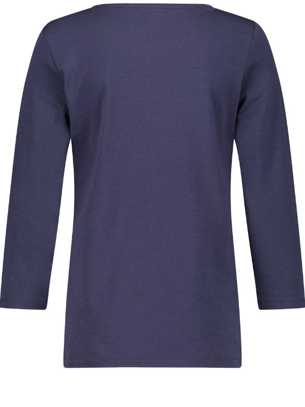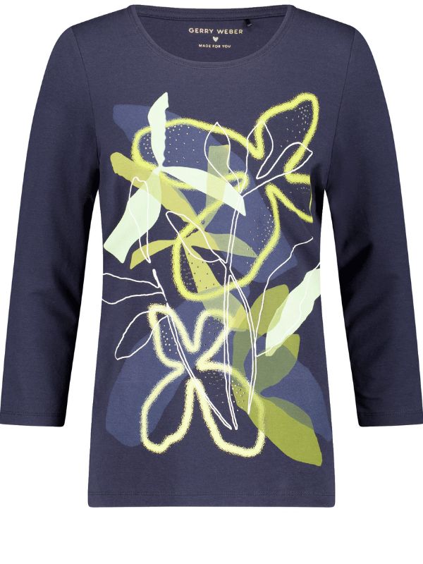 Αυτό το κομψό μπλουζάκι σε ναυτικό μπλε χρώμα διαθέτει καλλιτεχνική εκτύπωση στο μπροστινό μέρος με αφηρημένα μοτίβα λουλουδιών και φύλλων σε αποχρώσεις του λάιμ, του λευκού, του λαδί και του απαλού μπλε, που του προσδίδουν μια μοντέρνα και ζωντανή πινελιά.