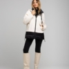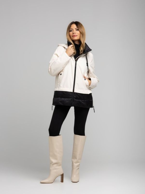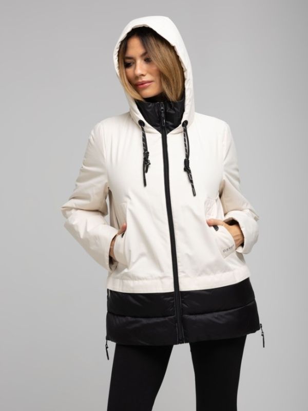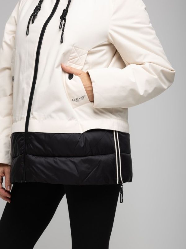 Μπουφάν με τσέπες και κουκούλα σε λευκό χρώμα με μαύρες λεπτομέρειες.