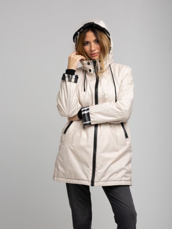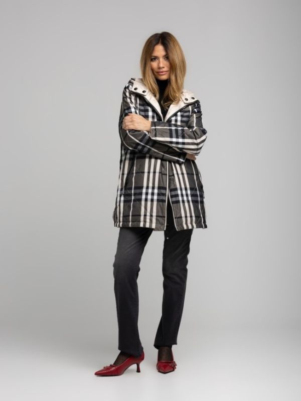 Μπουφάν midi με τσέπες και κουκούλα διπλής όψης. Συνδυάζει στυλ και ζεστασιά.