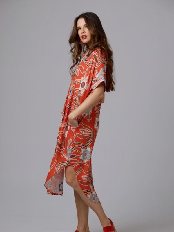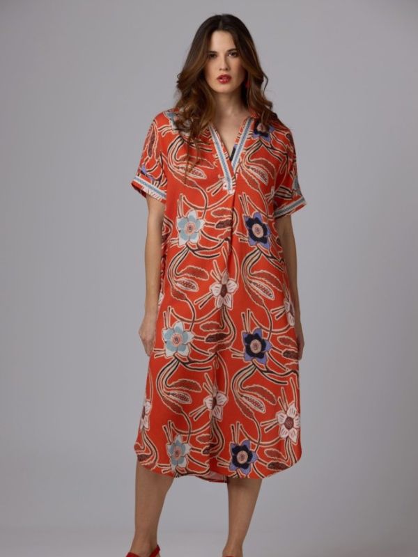 Rever Mile φόρεμα Midi με κοντό μανίκι αέρινο Floral κόκκινο.