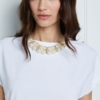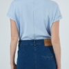 Κομψή γαλάζια μπλούζα με minimal γραμμή και εντυπωσιακή διακόσμηση από πέρλες και χρυσές λεπτομέρειες στο λαιμό. Διαθέτει άνετη εφαρμογή και ελαφρύ ύφασμα, ιδανική για chic εμφανίσεις από το πρωί έως το βράδυ. Συνδυάζεται εύκολα με παντελόνια ή φούστες για elegant looks.