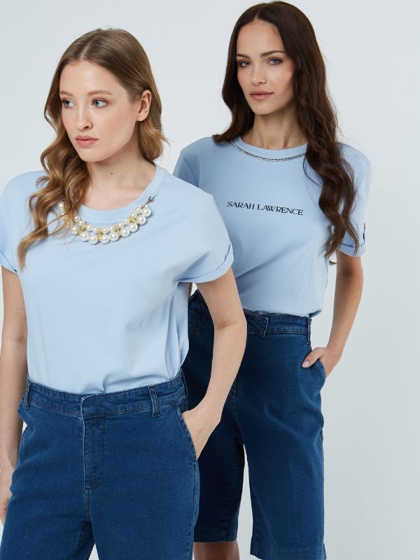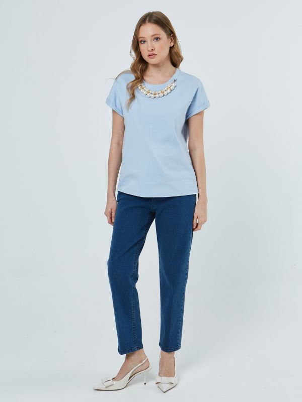 Sarah Lawrence Γυναικεία Μπλούζα Κοντό Μανίκι Με Διακοσμητικές Πέρλες Στο Λαιμό Γαλάζιο