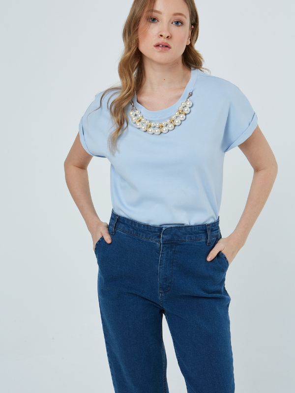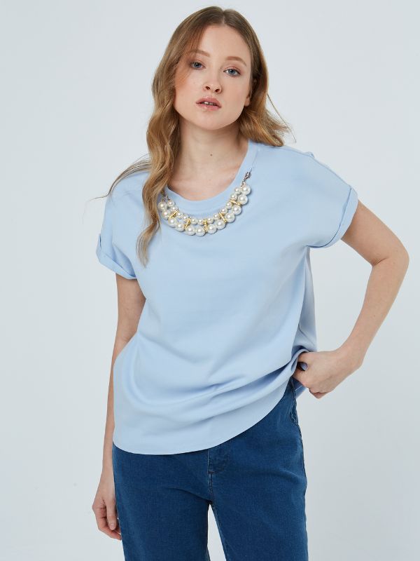 Κομψή γαλάζια μπλούζα με minimal γραμμή και εντυπωσιακή διακόσμηση από πέρλες και χρυσές λεπτομέρειες στο λαιμό. Διαθέτει άνετη εφαρμογή και ελαφρύ ύφασμα, ιδανική για chic εμφανίσεις από το πρωί έως το βράδυ. Συνδυάζεται εύκολα με παντελόνια ή φούστες για elegant looks.