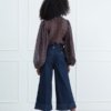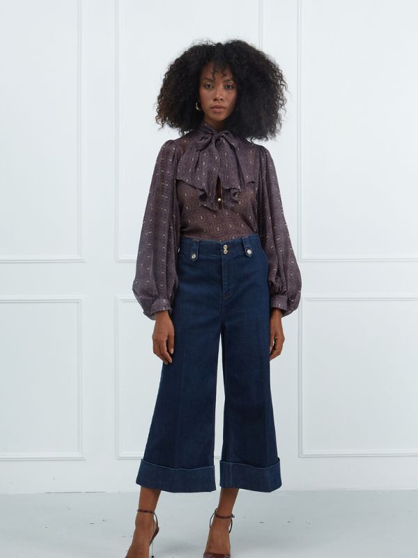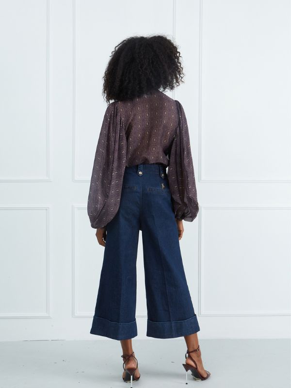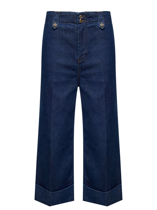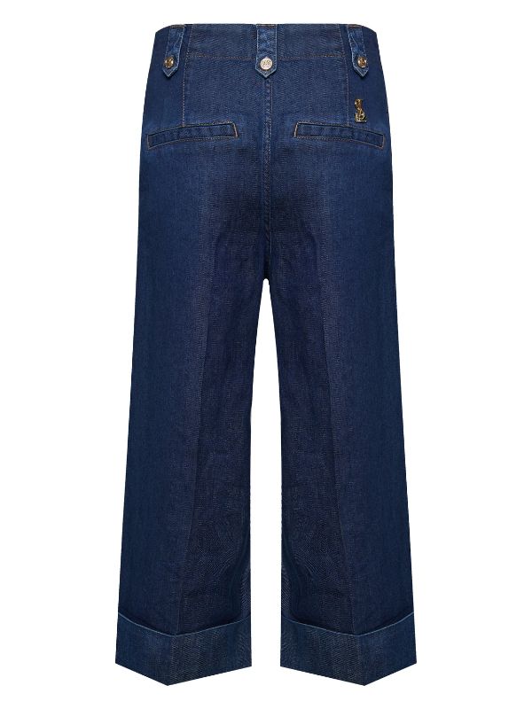 Στυλάτο παντελόνι denim σε φαρδιά γραμμή culotte, με ρεβέρ στο τελείωμα, χρυσά κουμπιά στη μέση για κομψές και μοντέρνες εμφανίσεις.