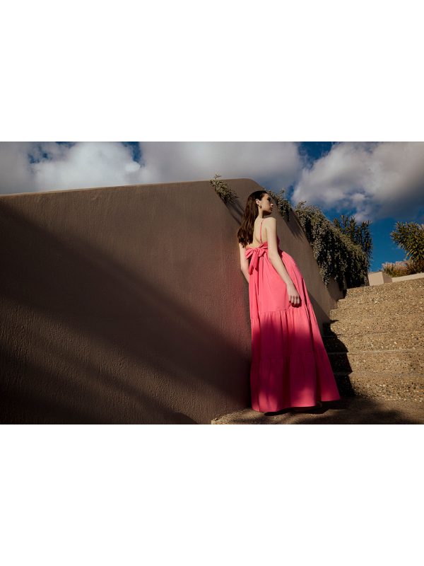 Αέρινο maxi φόρεμα σε φούξια χρώμα, με λεπτές τιράντες και δέσιμο με φιόγκο στην πλάτη.