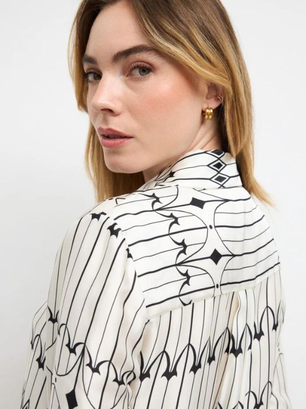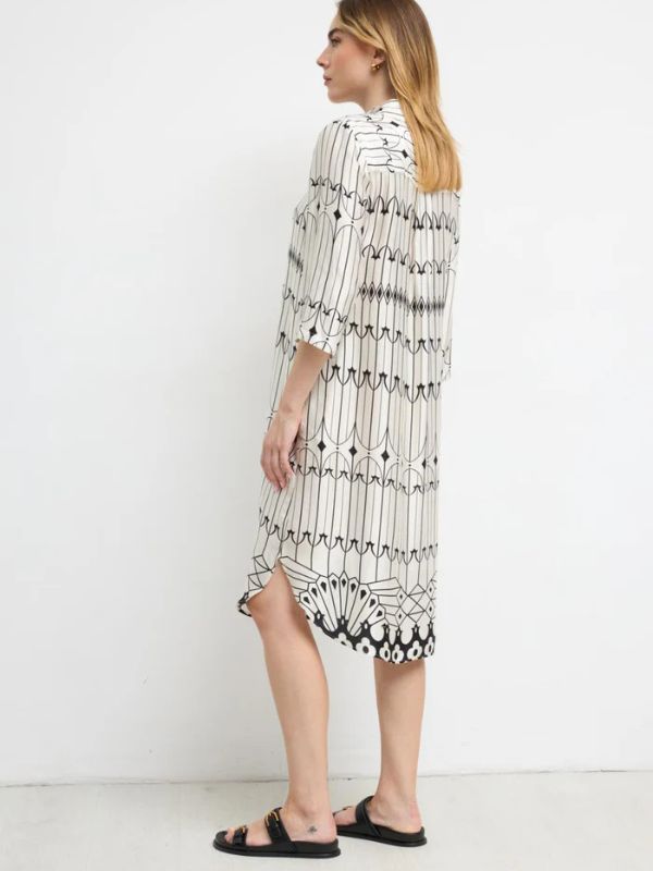 Φόρεμα με μανίκια 3/4, γιακάς πουκάμισου. Αρχιτεκτονικό μοτίβο. Ευθεία γραμμή και στρογγυλεμένο τελείωμα.